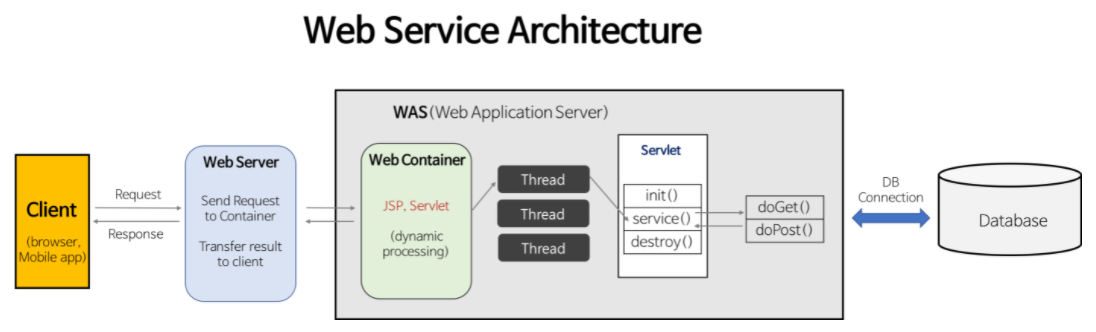 - Clinent ↔ Web Server ↔ WAS ↔ DB