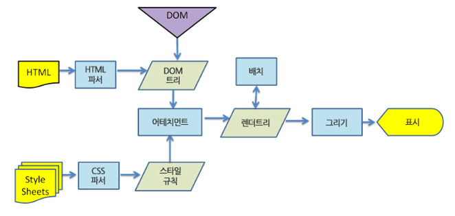 - 구문(HTML, CSS, JS) 분석 및 파싱 → 렌더링 → 돔 트리 구성 → 렌더 트리 구성 → 렌더 트리 배치 → 렌더 트리 그리기