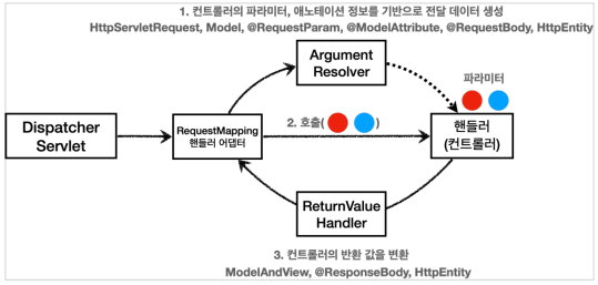 ① ArgumentResolver를 호출해서 컨트롤러(핸들러)가 필요로 하는 다양한 파라미터의 값(객체)을 생성한다.