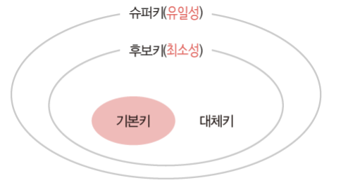 | 후보키(Candidate key) | - 유일성: 하나의 키 값으로 하나의 행을 유일하게 식별할 수 있어야 한다. - 최소성: 식별에 꼭 필요한 속성만으로 구성되어, 최소성을 만족시킬 수 있어야 한다. - 기본키도 후보키에 포함된다. - 모든 릴레이션에는 반드시 하나 이상의 후보키가 존재한다. |